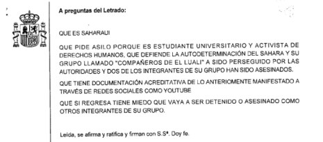 En el  acta judicial se dice que “pide asilo porque es estudiante universitario y activista de derechos humanos, que defiende la autodeterminación del Sáhara y su grupo llamado compañeros de El Luali ha sido perseguido por las autoridades y dos de los integrantes de su grupo han sido asesinados”.  A esto, se añade: “Si regresa tiene miedo que vaya a ser detenido o asesinado como otros integrantes de su grupo”.