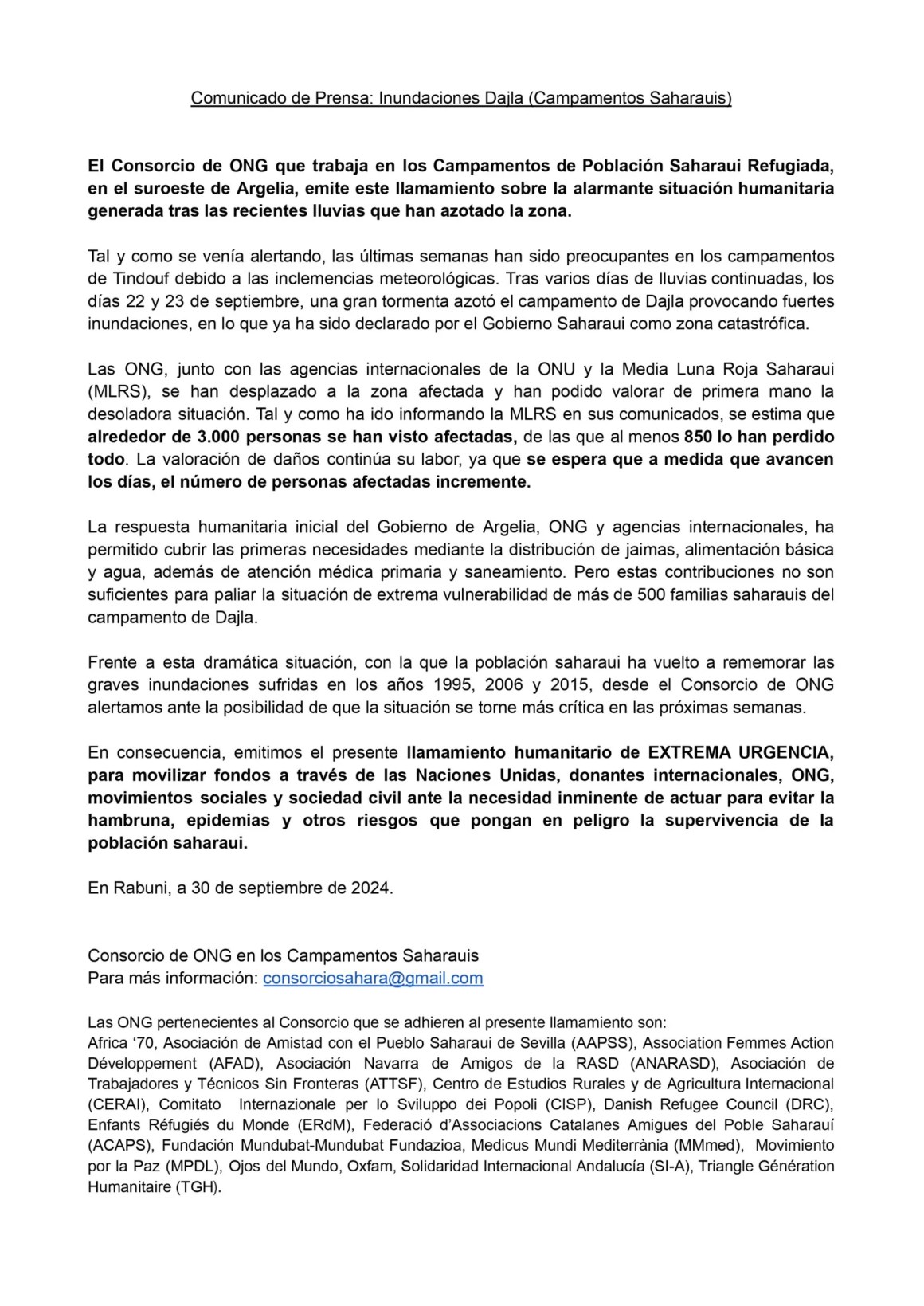 A pesar de la respuesta humanitaria inicial, que ha incluido la distribución de jaimas, alimentación básica y agua, así como atención médica y saneamiento, las organizaciones advierten que estas medidas son insuficientes. El comunicado enfatiza que más de 500 familias saharauis del campamento de Dajla enfrentan una “extrema vulnerabilidad” y que la situación recuerda las graves inundaciones sufridas en años anteriores, como en 1995, 2006 y 2015.