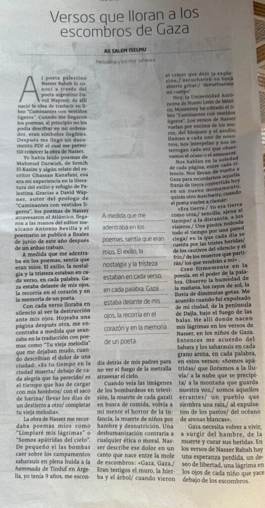 Hoy, la Universidad Autónoma de Nuevo León de México, Monterrey ha editado el libro «Caminantes con vestidos ligeros». Los versos de Nasser vuelan por encima de los muros, del bloqueo y el asedio, llaman a cada uno de nosotros, nos interpelan y nos interrogan cada vez que observamos el ocaso o el amanecer.