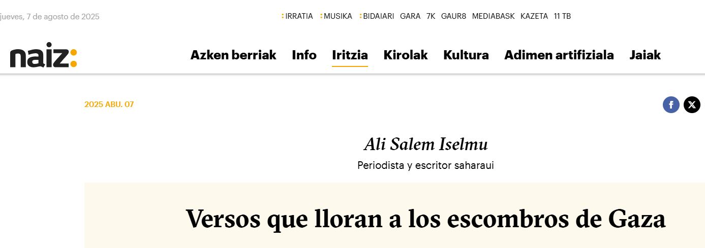 Creo firmemente en la poesía, en el poder de la palabra. Observo la humedad de la mañana, los rayos de sol, la lluvia de diminutas gotas. Me acuerdo cuando fui expulsado de mi ciudad, de la península de Dajla, bajo el fuego de las balas. He allí donde nacen mis lágrimas en los versos de Nasser, en los niños de Gaza. Entonces me acuerdo del Sahara y los saharauis en cada grano arena, en cada palabra, en estos versos: «Somos apátridas/ que lloramos a la lluvia/ a la nube que se precipita/ a la montaña que guarda nuestra voz,/ somos aquellos errantes/ un pueblo que siembra una raíz,/ al expulsaron de los pastos/ del océano de arenas blancas».