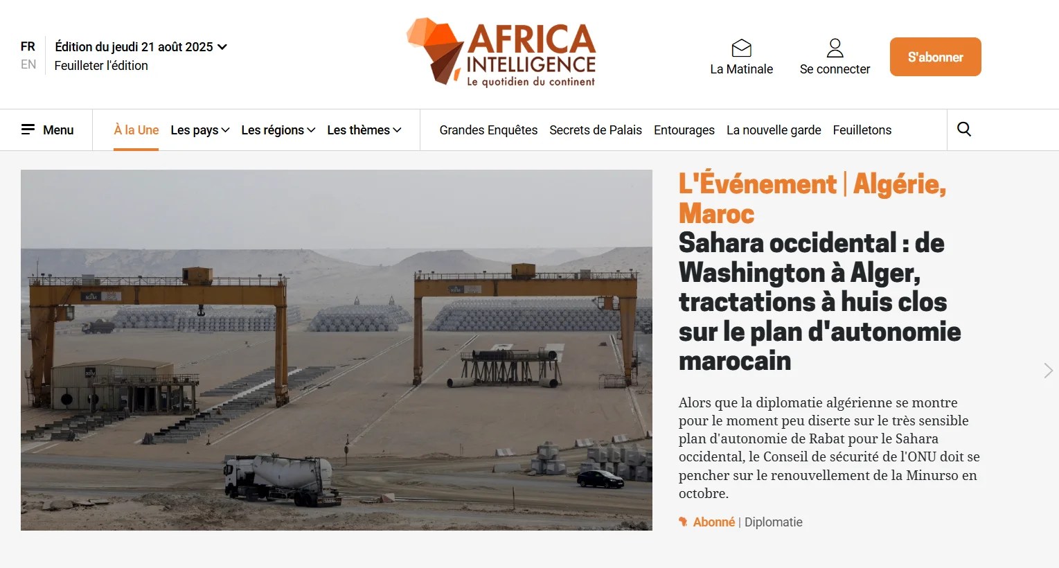 En un artículo de Africa Intelligence publicado hoy con el título de «L’Événement | Algérie, Maroc – SAHARA OCCIDENTAL: de Washington à Alger, tractations à huis clos sur le plan d’autonomie marocain» (SÁHARA OCCIDENTAL: DE WASHINGTON A ARGEL, NEGOCIACIONES A PUERTA CERRADA SOBRE EL PLAN DE AUTONOMÍA MARROQUÍ) se cita la existencia de intensas negociaciones secretas que se están llevando a cabo entre Estados Unidos, Francia, Marruecos en torno al llamado “plan de autonomía” marroquí para el Sáhara Occidental. La estrategia conjunta busca un objetivo central: borrar definitivamente del horizonte político y jurídico el referéndum de autodeterminación, piedra angular de todas las resoluciones de Naciones Unidas desde 1965, y sustituirlo por un marco negociado que consolide la ocupación marroquí bajo una apariencia de legalidad internacional.